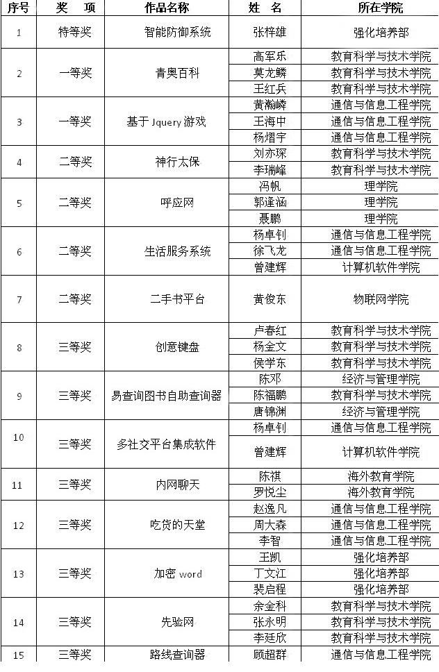 各参赛选手经过激烈角逐,最终评出来自强化培养部张梓雄同学的作品《智能防御系统》获得特等奖,来自教育科学与技术学院的高军乐同学的作品《青奥百科》等2件作品获得一等奖,另有4件作品获得二等奖以及8件作品获得三等奖。