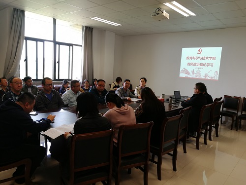 2019年4月17日下午,教育科学与技术学院党总支组织全体教职工在文科楼426会议室开展政治理论学习活动。本次学习活动的主题是“深入学习贯彻学校第三次党代会精神--全面开启研究型大学建设新征程为实现特色鲜明高水平大学目标而奋斗”。学习活动由学院党总支书记刘蒙主持。