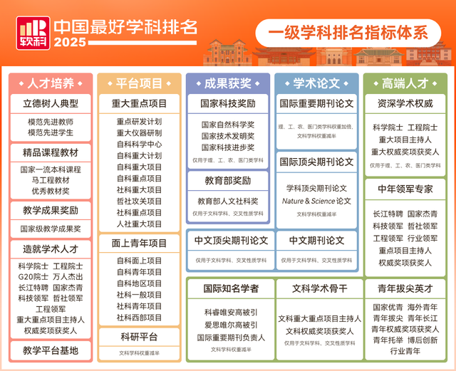 软科中国最好学科排名(一级学科)指标体系包括人才培养、平台项目、成果获奖、学术论文、高端人才5个指标类别,下设19个指标,共计200多项反映学科竞争力的观测变量。今年指标体系的变化包括:新增教学平台基地指标,包含国家级虚拟仿真实验教学中心和国家级实验教学示范中心;在科研平台指标下新增“一带一路”联合实验室以及水利部、住房和城乡建设部、交通运输部等部委的科研创新平台。今年首次推出的软科中国最好学科排名(专业学位类别)指标体系设置人才培养、师资队伍、研究创作、学术论文和社会声誉5个指标类别,下设18个指标,共计100多项反映学科竞争力的观测变量。专业学位类别的排名指标体系纳入了创作实践项目、专业作品成果、杰出校友等特色指标,在兼顾学科点理论水平的同时,侧重反映学科点在服务国家和行业需求、培养实践创新人才方面的能力与成效。软科中国最好学科排名的数据全部来自第三方数据源,如教育部、科技部、国家自然科学基金委员会、国际和国内文献数据库等。