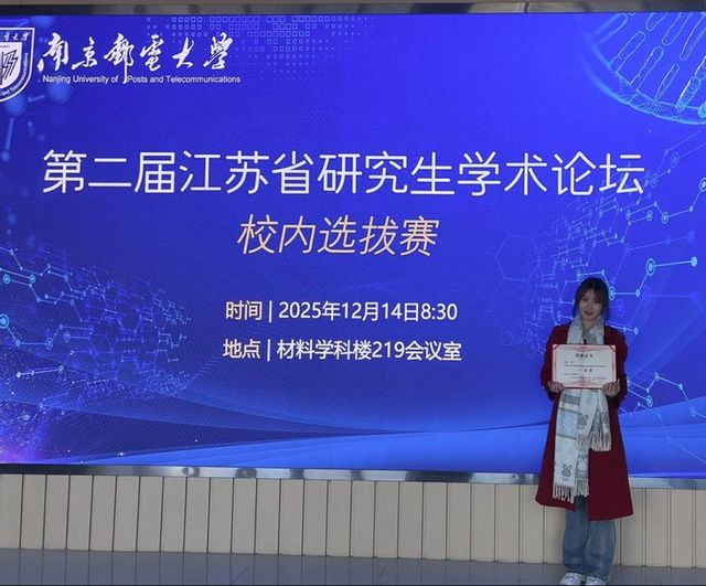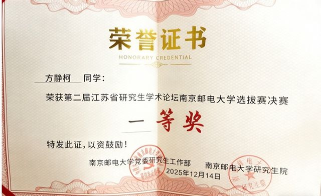 冬日暖阳,喜讯传来。2025年12月14日上午,第二届江苏省研究生学术论坛校内选拔赛决赛顺利落幕,我院推荐参赛的两位选手2024级研究生方静柯与2025级研究生万雨欣均荣获一等奖!